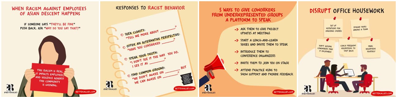 Here are some awesome resources with illustrations to help use all become better allies and create more inclusive engaging workplaces. Use them, share them and don’t forget to credit @betterallies for their awesome work here! There’s also plenty of more content on this page and a newsletter if you are interested