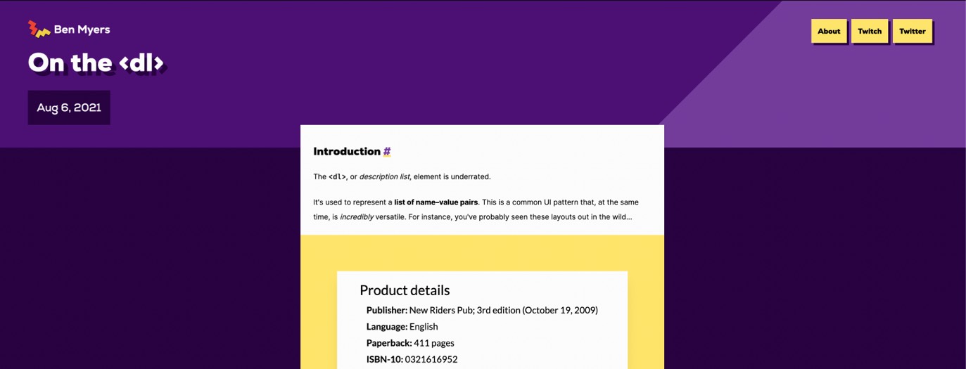 <dl> (for description list) is used to represent a list of name–value pairs. I think it’s one of the most underused tags (most people just use divs for that). Here’s everything you need to know about it (and <dt> <dd>) by @BenDMyers