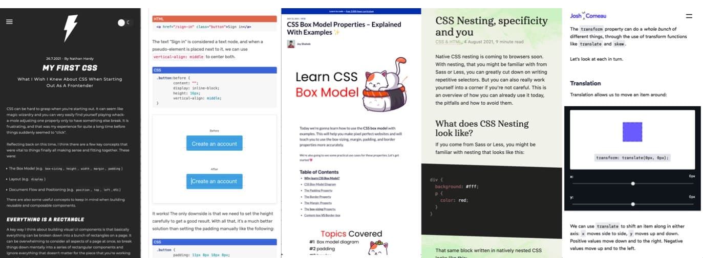 - What I (@nhardy96) Wish I Knew About CSS When Starting Out As A Frontender: box model, layout, document flow and position, a great wrap up for CSS beginners