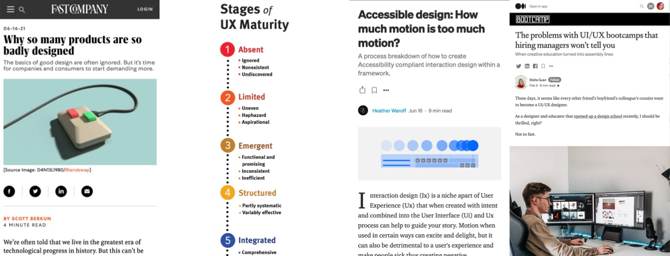 “The problems with UI/UX bootcamps that hiring managers won’t tell you – When creative education turned into assembly lines”, Stella Guan highlights some of the issues with bootcamp & also some university programs