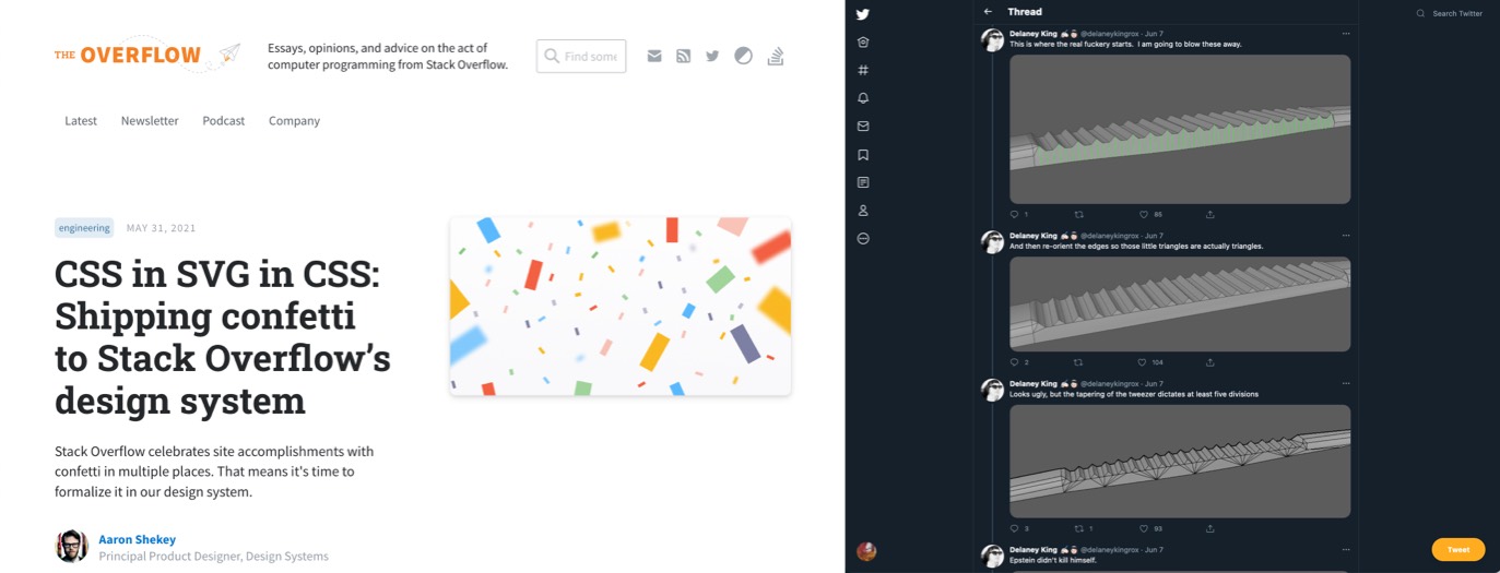 This is fun and smart: “CSS in SVG in CSS: Shipping confetti to Stack Overflow’s design system”