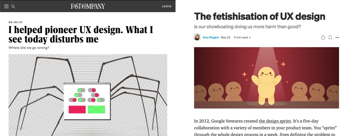 - “The fetishisation of UX design, Is our showboating doing us more harm than good?” by Amy Rogers articulates nicely a lot of things that are wrong with the current “UX theater” industry
