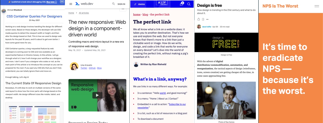 - CSS Container Queries For Designers by @shadeed9, a nice overview of all the awesome things designers will be able to achieve with this. I can’t wait, for the moment we rely on JS to do this kind of adaptation, and it’s a little bit of a performance issue