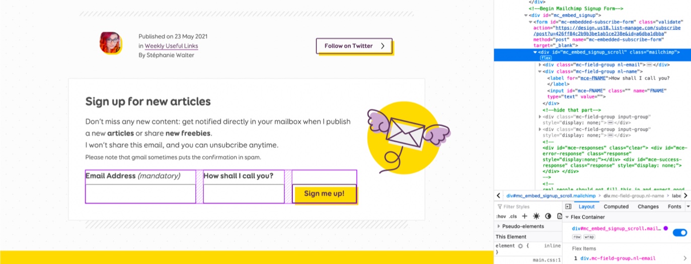 I played with some flexbox fun to add the newsletter form directly at the bottom of every article now. If you understand French, I’ll talk at “Faiseuse du web” next week about 10 things I learned in 10 years of being a Designer. It’s online, free and will be captioned in French. Also, Laurence Vagner and I will co-host a workshop on cognitive biases for Flupa (in French too)