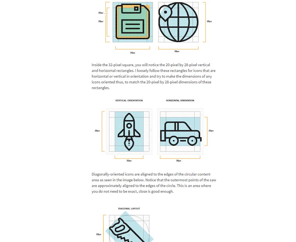 Better Icon Design in 6 Easy Steps, 6 étapes pour vous faciliter le design d’icônes. Son utilisation de la grille est particulièrement intéressante ici.