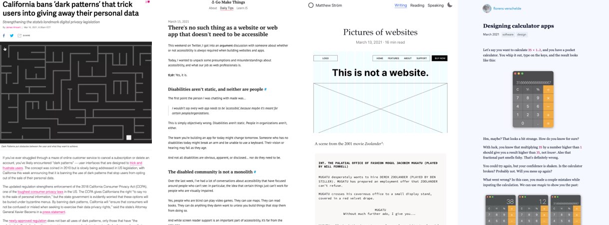 Every day, I share on Twitter and LinkedIn a list of curated articles I read, resources and tools about UX Design, User Research, UI and mobile design, HTML, CSS, the web industry, some process, some inspiration, etc. This is an archive of everything I shared this week.