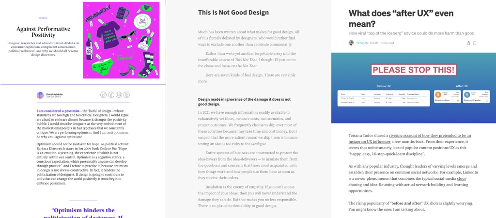 “What does “after UX” even mean? How viral “top of the iceberg” advice could do more harm than good.” by Yichen He. I agree 100% with everything said here, those “before UX/after UX” need to go away and are harmful.