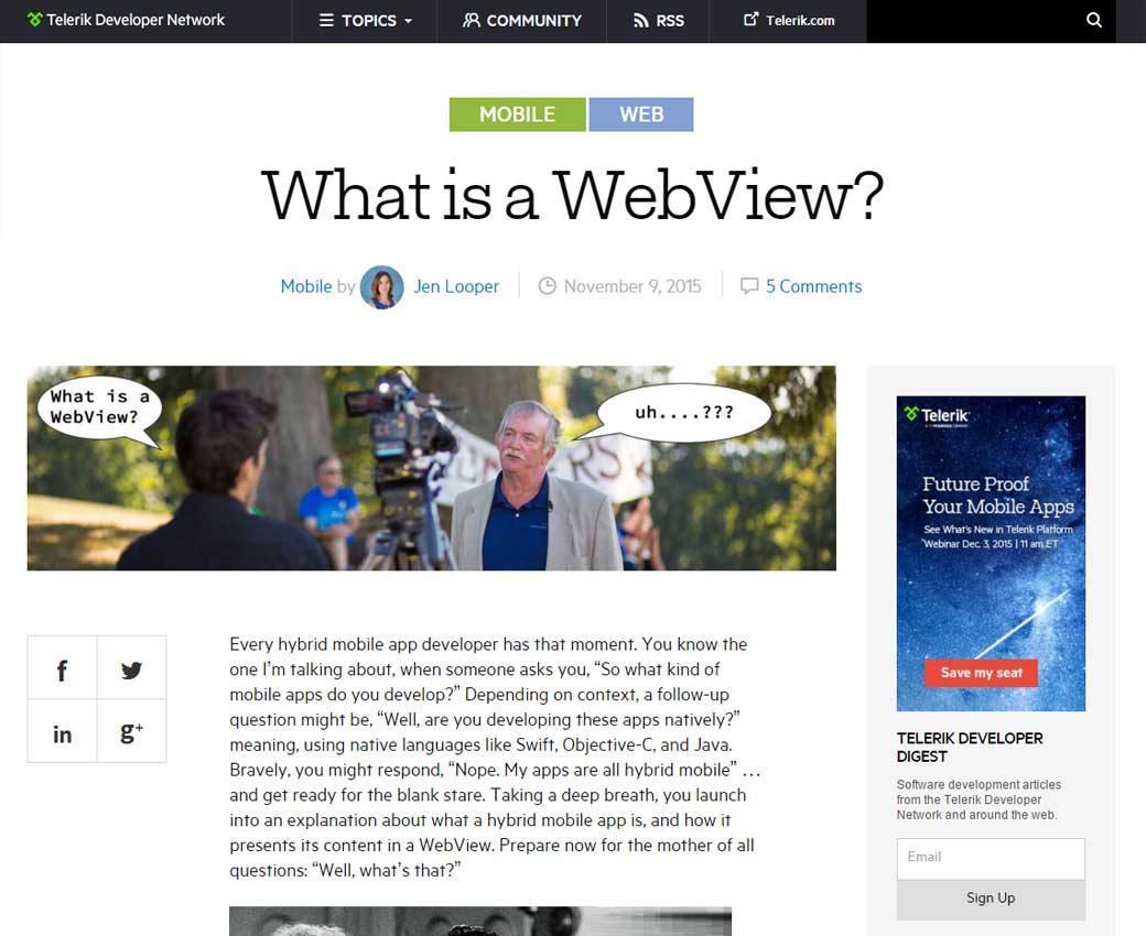 What is a WebView?, un excellente article sur le concept de webview, ces fenêtres de navigation à disposition des développeurs mobile (et desktop vous le verrez en fin d’article) qui permettent d’afficher du contenu web dans des applications hybrides ou d’embarquer un navigateur dans votre application pour y ouvrir les URLS comme le font Facebook, Twitter, etc. sur mobile