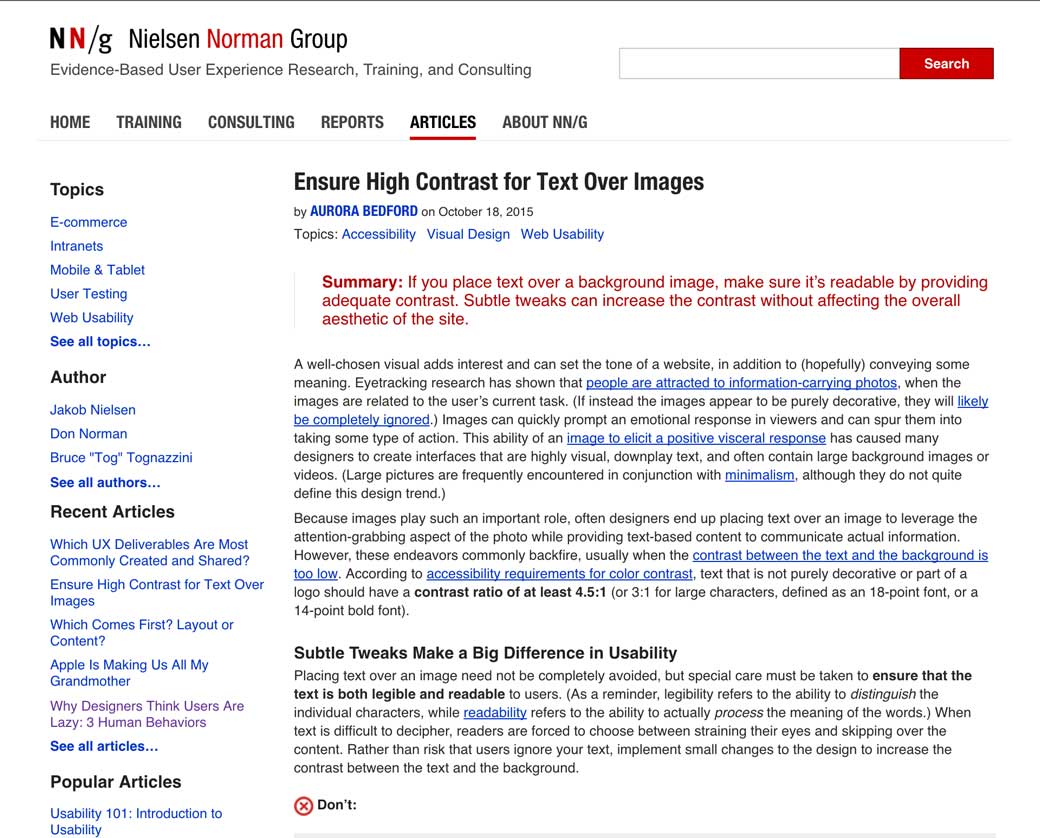 Ensure High Contrast for Text Over Images – si vous placez du texte au dessus d’une image de fond, assurez-vous qu’il y ai assez de contrastes
