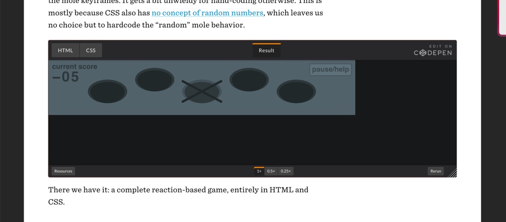 Hahah this is a fun little game and how to build it: “Whack-a-Mole: The CSS Edition” by Will Yu (full game at the bottom of the article)