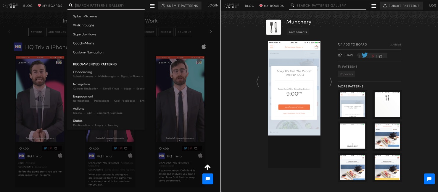 On Mobile Patterns, you can navigate by different UI patterns or chose to navigate only Android or only iOS designs. Some apps are presented static images but some other are presented with videos of the app. This way you can also see interactions and UI animations on top of the different steps of the pattern process. The search at the top makes it easy to find anything you are looking for.