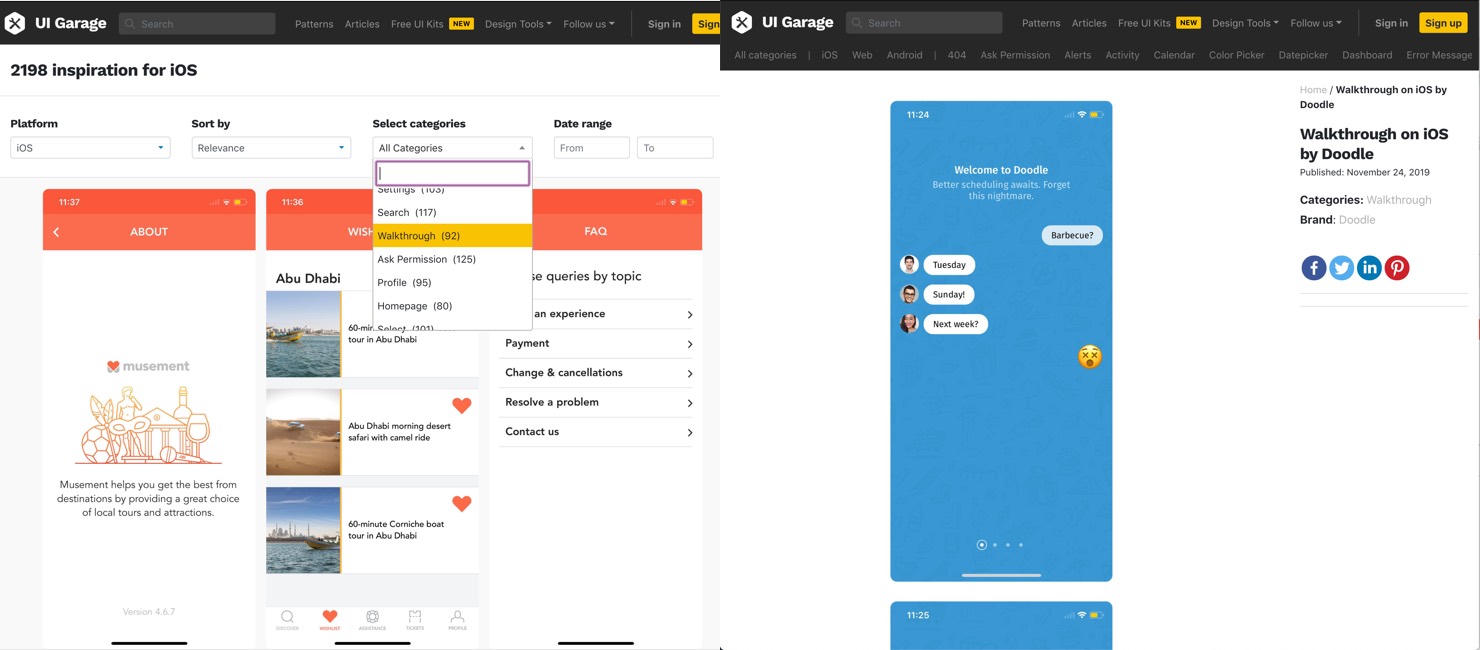 UI Garage is a generic site for UI inspiration. You can use the filters on the homepage to target specific mobile platforms (iOS, Android) and then browse the content by UI pattern/process categories. Most detailed pages only offer a single screenshot so it’s a little bit complex if you want to see a whole flow but some pages have quite a few screenshots for the same patter or process.