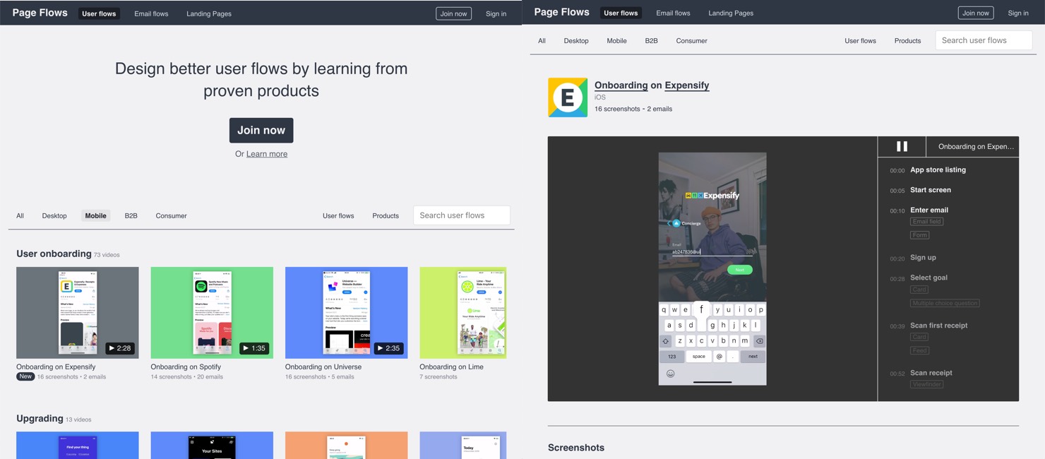 Pageflow is a site that showcases different user flows of popular products. You can browse the mobile section to find video examples of specific user flows for mobile apps. You can’t combine search for mobile and a specific flow though so you will have to go through the whole page. Some of the videos are free but most of the content is behind a $8.25 per month paywall.
