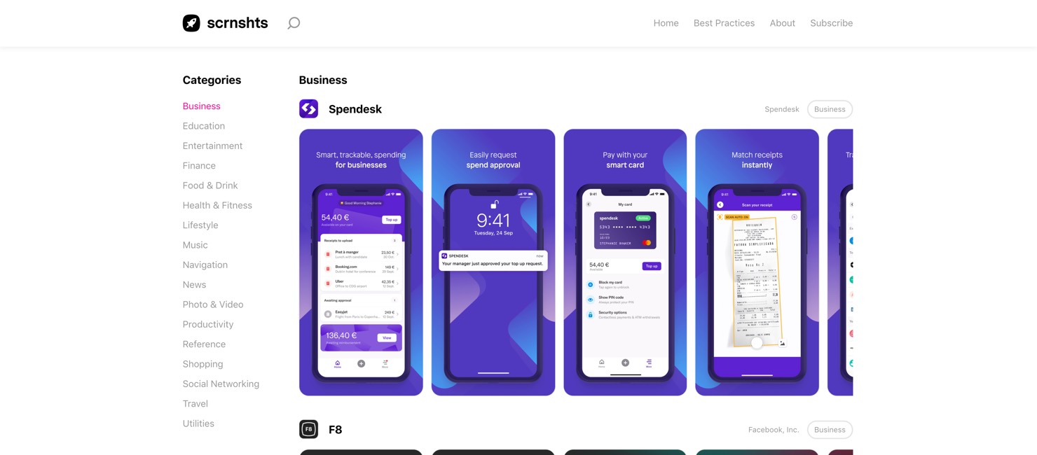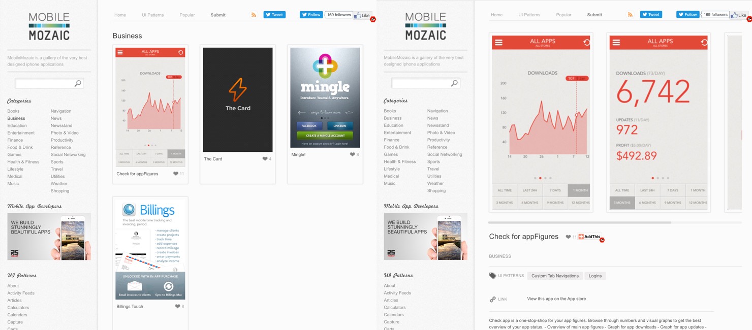 On Mobile Mozaic you either navigate by app categories (books, game, lifestyle etc.) or by UI patterns. The category is quite convenient if you are working in a specific market and are looking for competition/inspiration. The UI pattern navigation exists but it’s quite useless: once you open an app, the detail page shows you all the screenshots for this app. So this is not super useful for specific patterns. The copyright on the site is 2016 but the RSS has some entries in 2019, still, many of those screenshots might be outdated. Still good for the app category part.