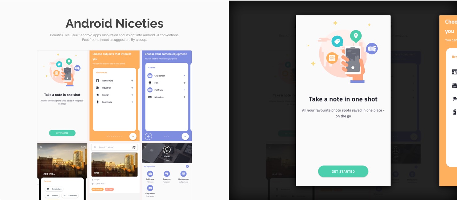 If you are looking for some “real” mobile app inspiration, there’s quite a few resources that specialise in mobile UI patterns, mobile components, mobile flows and app category. Here is a selection of sites I use a lot when I design native Android and iOS apps with my honest review about what I like and don’t on those sites. I will put them all here so that I don’t need to go through my bookmarks every-time I need them. Feel free to add extra resources in the comments.