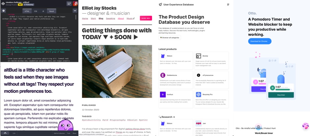 “altBud is a little character who feels sad when they see images without alt tags! They respect your motion preferences too” A cool codepen demo by George Francis @georgedoescode