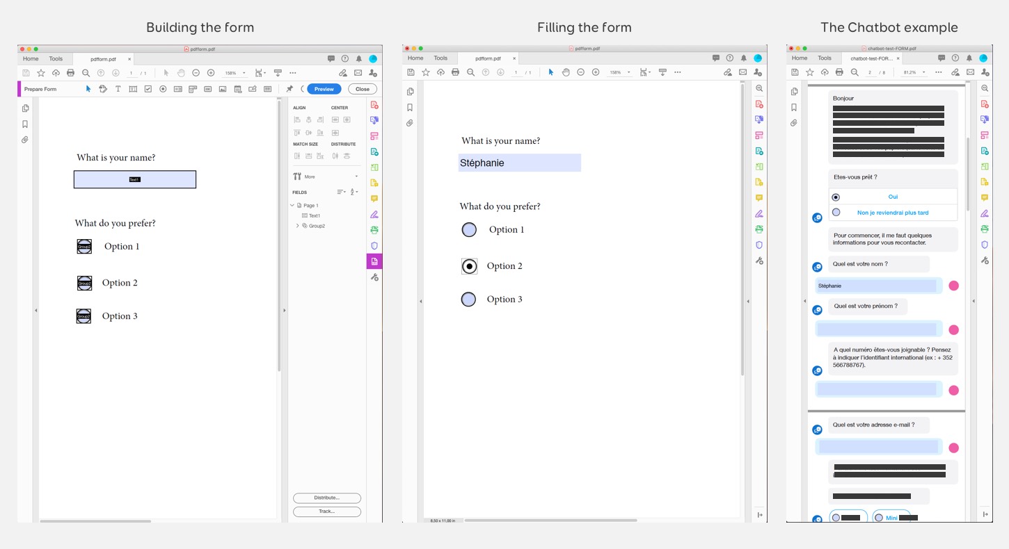 Building PDF forms with Acrobat and an example of the chatbot PDF form on the right.