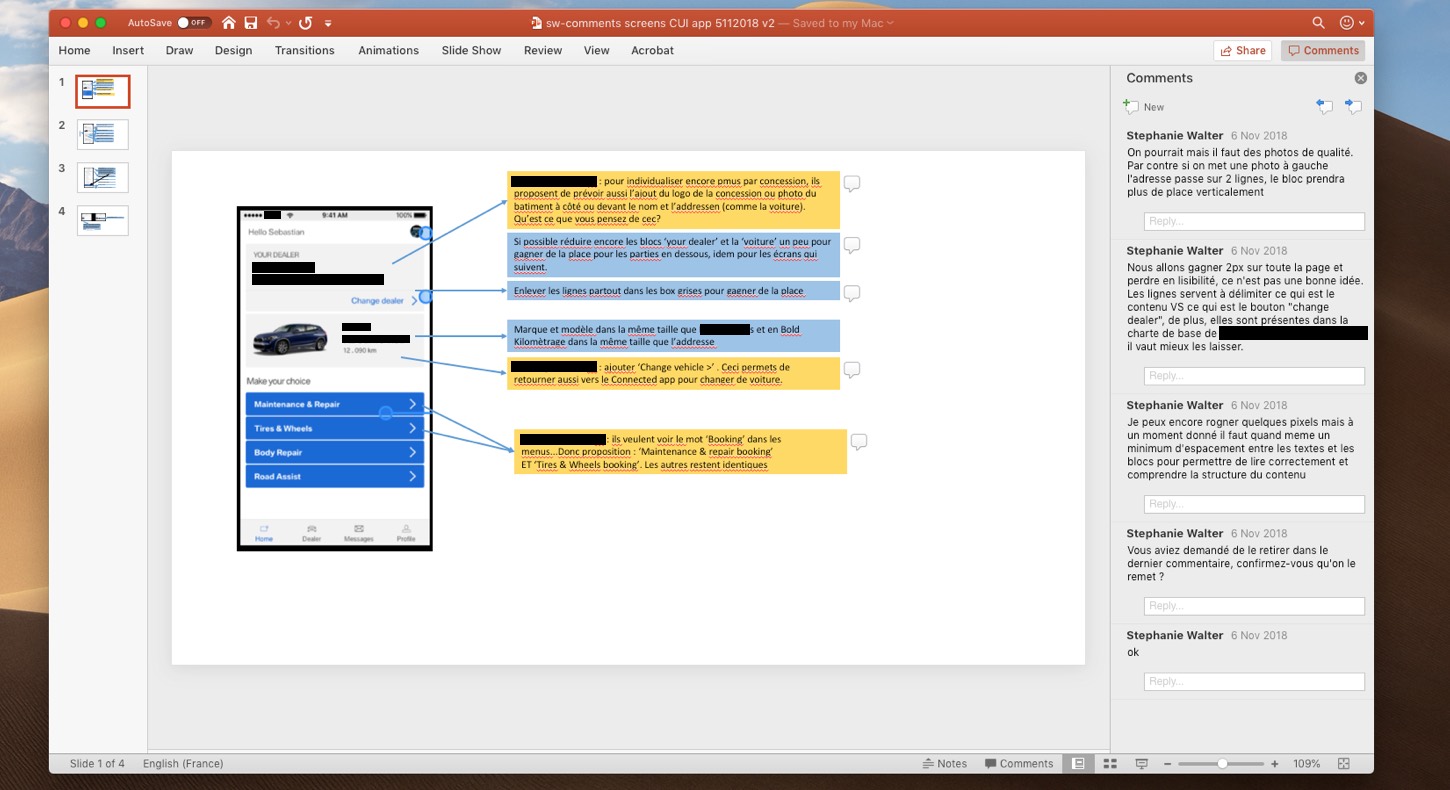 I organise those sessions face to face or remotely with a screen sharing of my prototype. Often, I don’t even need comments for feedback sessions, since I gather those directly during the live sessions.