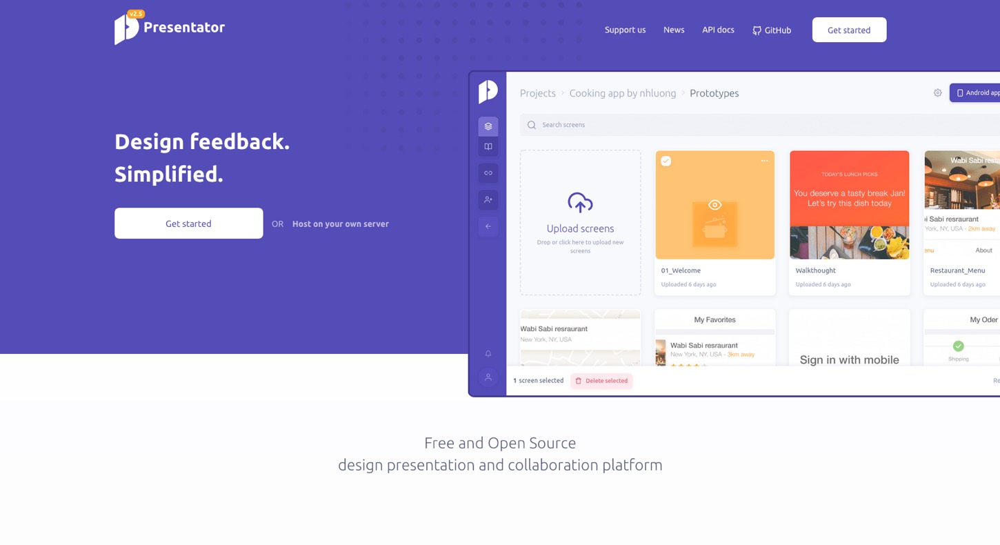 Presentator.io is a free and open source design presentation and collaboration platform. It is self-hosted but the whole “docker container” brought fear to my heart. I tried to install it on my Mac with a local server, but I gave up trying to make this work after 1 hour of googling my docker errors. I tried the online demo. It looks nice, and it should be awesome if you manage to make it work in your environment. I’m not a fullstack developer, following the documentation is as far as I can go. Some days I wish design tools would not need you to also be an expert in the whole full stack to be able to install them. But maybe you will have better luck than I had (or even better, ask your developers to install it).