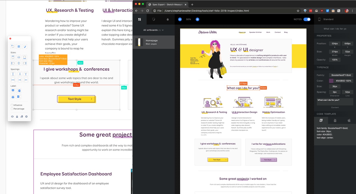 - A measure tool that helps you add specifications directly on your mockups files. (like font-size, color but also margins and paddings between elements, etc.)