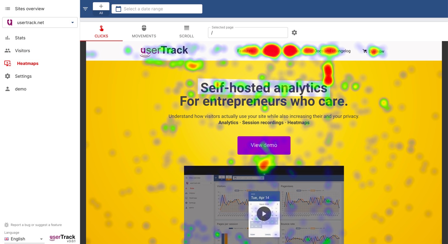 User Track is another self-hosted analytics solution. It is not open source nor free though (monthly or one-time fee licence). It comes with some built in features: analytics, heatmaps, segments and some session recordings. It’s kind of a “one single platform” to do it all. Check the documentation to see minimum requirements and usage.