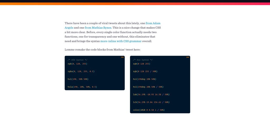 “ No-Comma Color Functions in CSS ” I like this idea because I tend to forget some of those commas but the /50 % at the end takes some getting used to but you can also still use the old 0.5 syntax: rgba(0, 128, 255, 0.5) -> rgb(0 128 255 / 50%) hsla(198, 28%, 50%, 0.5) -> hsl(198deg 28% 50% / 50%)
