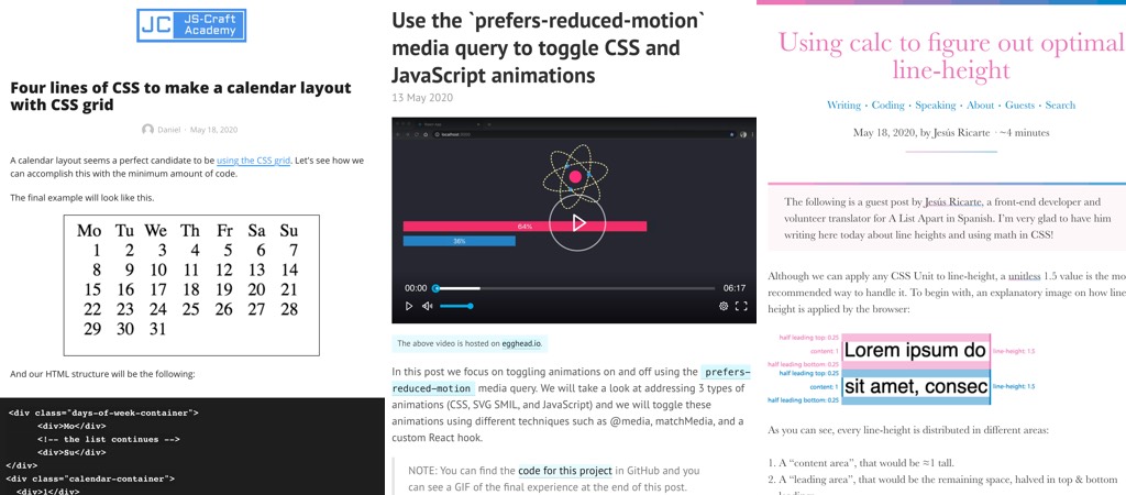 - “Four lines of CSS to make a calendar layout with CSS grid” this is amazing, remember how annoying it was to create those with floats?