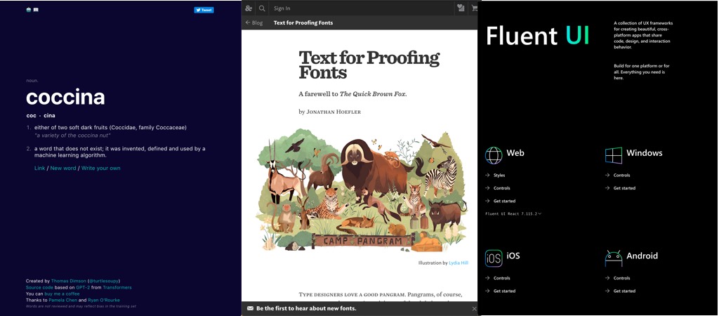 This week’s selection: bringing back XP style in CSS, CSS Grid Calendar, designing interfaces for expert users, user research synthesis, accessibility of conference calls, accessibility of dataviz, of images, animations and accessibility, text for proofing fonts, CSS Grid tutorial, Microsoft’s Fluent UI design system, on splitting form inputs, words created by machine learning, CSS no comma color functions, etc.