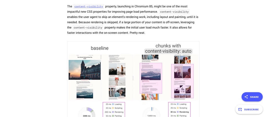 content-visibility enables the user agent to skip an element’s rendering work, including layout and painting, until it is needed (Chromium 85), this is an interesting boost for performance 😮