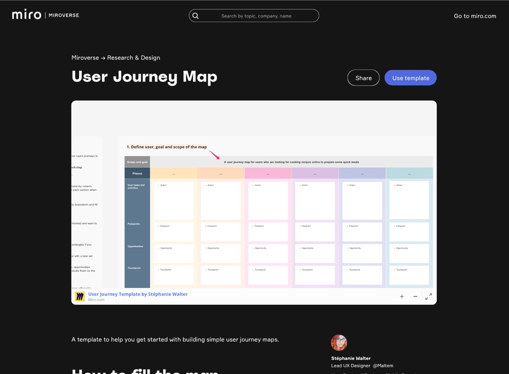My user journey map template is now available directly on Miro as part of the Miroverse templates. You can now import it as starer template for your own projects!!! You can also check my Introduction to User Journey Map to understand better the how and why to create one.