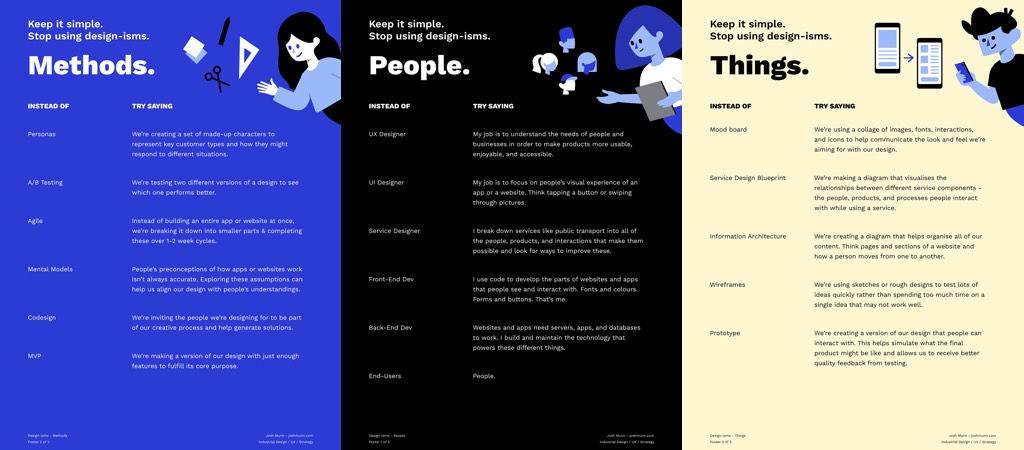 Poster prompts to avoid Design-isms, 3 posters to help you avoid too much jargon in your communication with colleagues by Josh Munn. I like this idea of having artefacts to help us communicate with less technical jargon