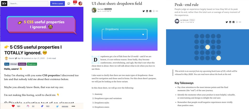 This week’s selection: a few articles on designing dropdowns, some CSS useful properties, CSS for internationalisation, portfolio tips, the peak end rule, responsive layout without Media Queries, CSS focus-visible trick, 98Windows UI CSS library, better mobile experience with HTML5 inputs, using Figma for remote note taking, an ebook on animation in design systems, CSS clip-path animations, Disney Imagineering and the Mickey Pal character, etc.