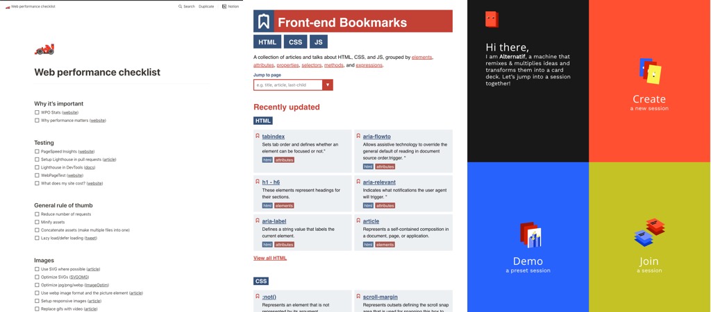 frontendbookmarks.com this is really cool, worth bookmarking (hehe): a collection of articles and talks about HTML, CSS, and JS, grouped by elements, attributes, properties, selectors, methods, and expressions