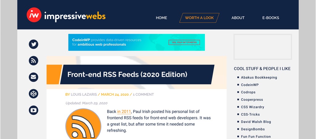 RSS is not dead, yeaaah, Impressive Webs is sharing his list of Front-end RSS Feeds (2020 Edition) in case you are looking for people and blogs to follow