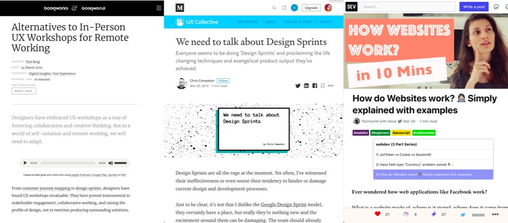 “Alternatives to In-Person UX Workshops for Remote Working” by Paul Boag: don’t try to replicate in person workshops, group video calls sucks but 101s are fine so involve stakeholders with 101 sessions and interviews, etc.