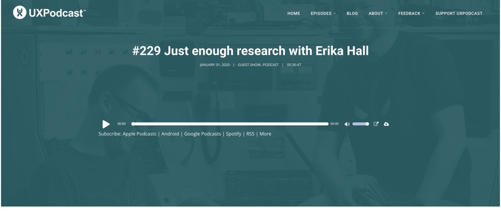 UX designers, you have to listen to this podcast with Erika Hall about when do you have enough research to take decisions, understanding users but also organisation & political environments when designing, how easy it is to do a terrible survey, etc. “With a survey, people will answer your questions. Even if you’re asking the wrong questions in the wrong way, and they totally don’t match anything in the real world, you’ll get answers back. And there won’t be anything in that data that will tell you that it’s a bad survey”. I soooo much agree with that part. It’s HARD to create a great survey even for advance UX practitioners. But tools make it look soooo easy so it’s usually the “cheap” way to do user research. I was asked so many times to reply to surveys that were poorly designed and could tell the information was going to be totally biased (at best…). I even told some people about the flaws in their surveys but apparently bruised too many egos. Even for academic people it’s hard to design good surveys.
