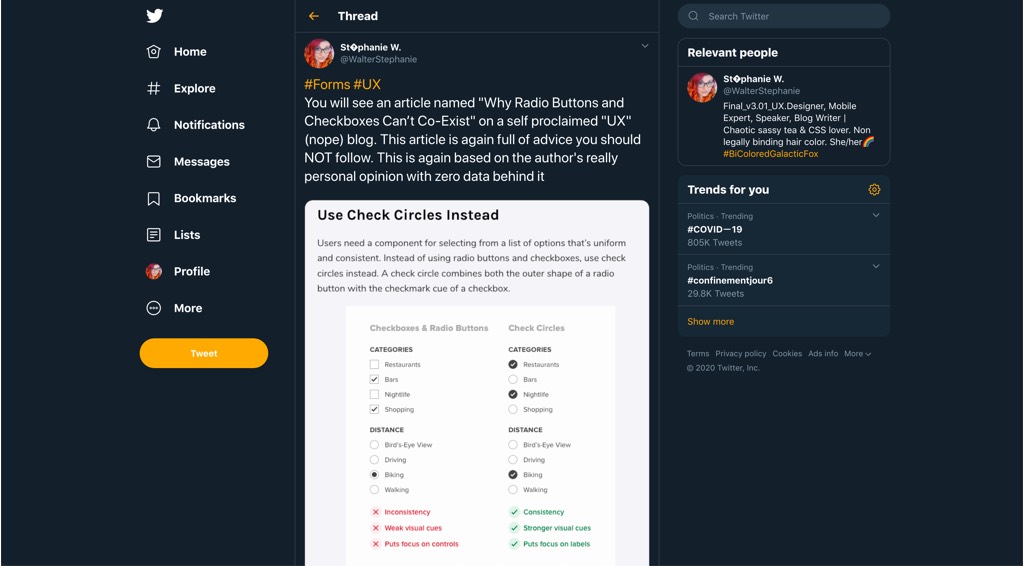 For once, I will put one of my twitter thread as “you should not miss”, it’s about checkboxes and radio buttons. Because I’m tired of seeing UX newsletters sharing those kind of articles. You will see an article named “Why Radio Buttons and Checkboxes Can’t Co-Exist” on a self proclaimed “UX” (nope) blog. This article is again full of advice you should NOT follow. This is again based on the author’s really personal opinion with zero data behind it