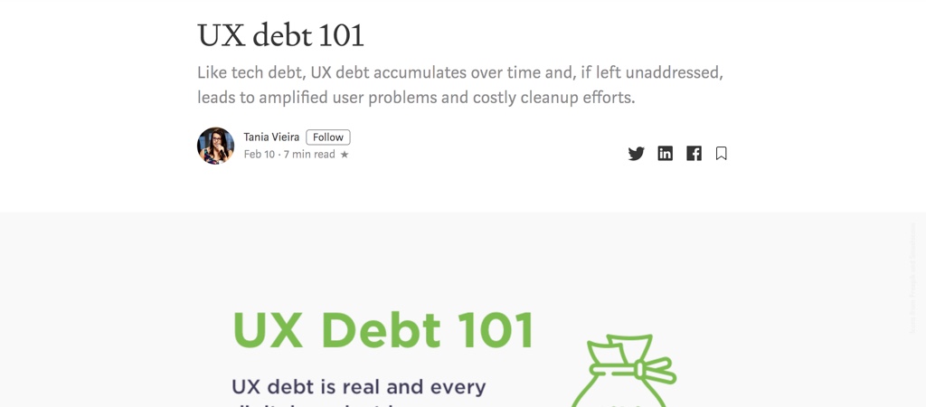 “UX debt is an accumulation of design and development decisions that negatively impact the users of a product or service.” Based on the reasons in the article I’d say that many projects also create this debt from the beginning and it accumulates. Time pressure, unrealistic constraints, ignoring standards, misinterpreting product vision, skipping user testing, design by committee, poor communication or documentation, etc. All of that can happen from the very first day of the project and continue all the way till the end
