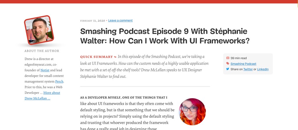 This week I was invited on the Smashing Podcast from @smashingmag. We’re taking a look at UI Frameworks and how can the custom needs of a highly usable application be met with a set of off-the-shelf tools: Smashing Podcast Episode 9 With Stéphanie Walter: How Can I Work With UI Frameworks?