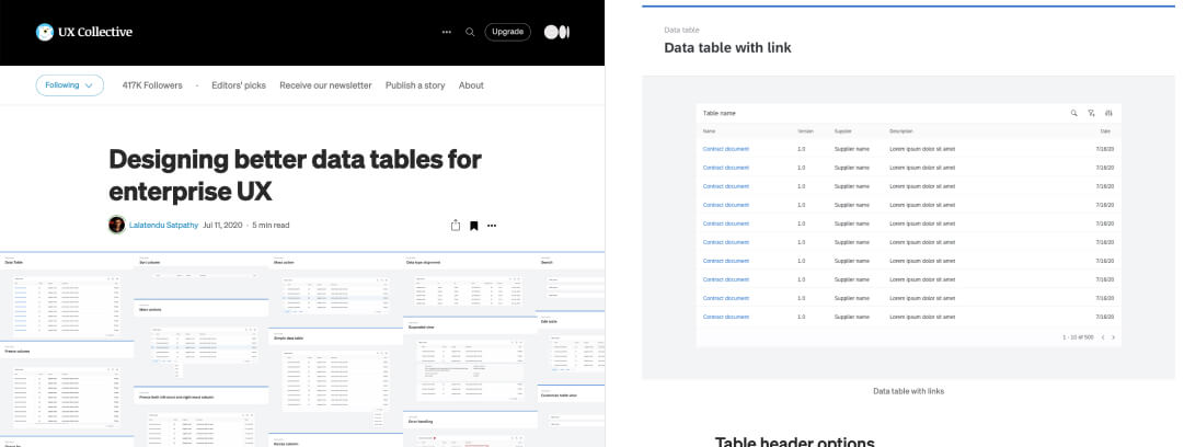 This article gives a lot of visual examples of how to design tables for enterprise products: simple data, data with images (like avatars), with a link, headers, search in column, tables that can be customized, sorted, tables with a large number of columns with column freeze, editable datas, errors and actions, data alignment, grouped data and resizable columns.