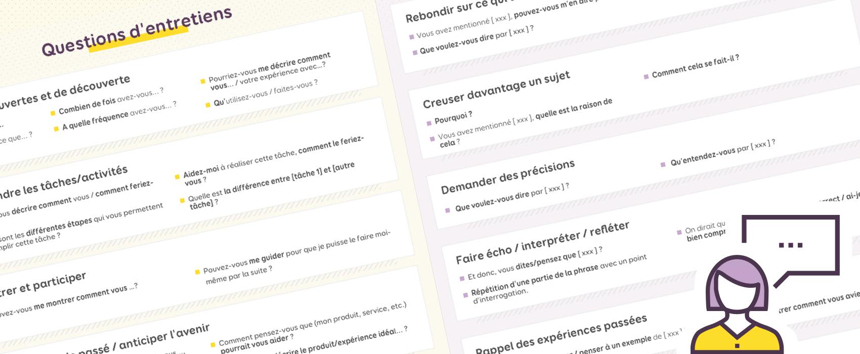 Si vous êtes faites de la recherche utilisateur, ce petit aide mémoire de « Questions Type et Relances d’Entretiens Utilisateur » que j’ai publié pourrait vous être très utile.