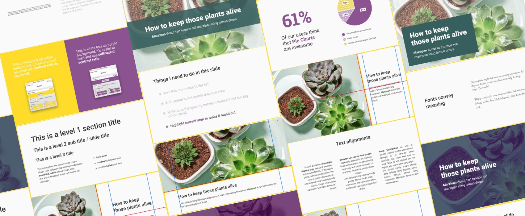 When it comes to colors, be careful with text/background contrast and follow main accessibility guidelines. Especially if the slides might be displayed on old projectors. I am not going to detail how to pick colors here, I wrote about it in “Tips to Create an Accessible and Contrasted Color Palette“. Also check “Color accessibility: tools and resources to help you design inclusive products” for more details and tools to help you. Also Geoffrey Crofte has an awesome article on “Pantone 2021: Working on an Accessible Color Palette“.