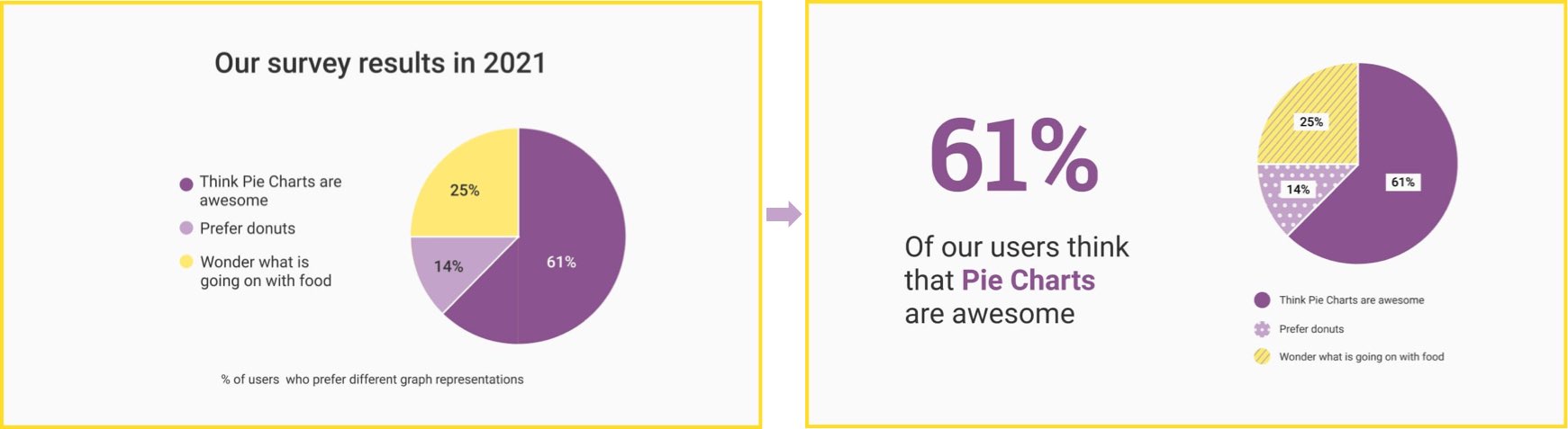 - If you really need a graph, try to make it simple. Avoid gradients and visual noise. Remove unnecessary information. Keep in mind that it’s supposed to be a visual help for your talk, not the other way around.