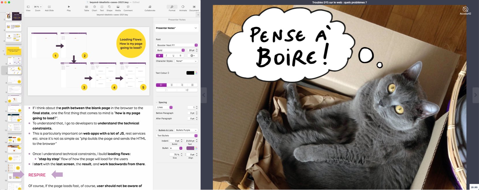 - Talking will dry your mouth and it’s actually a big brain activity, your brain needs water. Have a few slides where you know you can drink some water. It can be a title slide. Or you could have a cute slide with your pet on it, that works too. My friend Marie Guillaumet does that and the audience loves it. Here’s her cute cat.