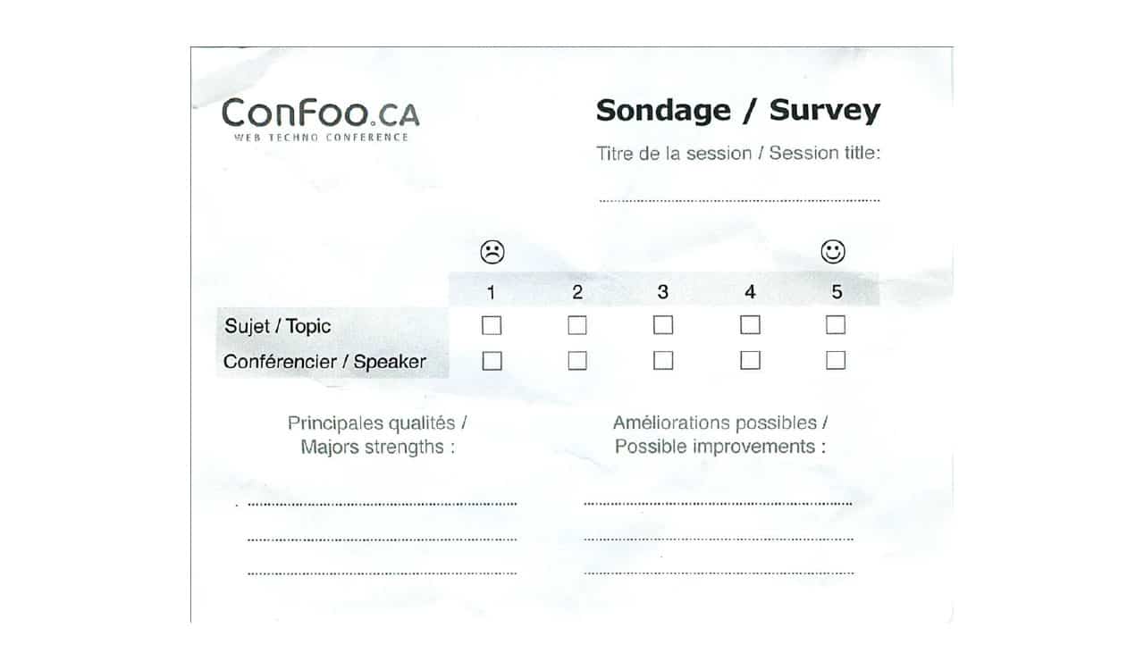 A la fin d’une conférence, les organisatrices et oratrices aiment souvent collecter les retours des participantes. Lorsque j’étais à Confoo, nous recevions à la fin de chaque conférence un petit papier à remplir à la main. L’équipe se chargeait ensuite de les collecter, les scanner, les résumer et envoyer à l’oratrice une note moyenne avec une sélection des remarques. C’était franchement génial et impressionnant de recevoir par mail les retours de sa conférence à peine 1h après l’avoir donnée. J’imagine cependant que ça devait être un travail très conséquent de la part du staff de Confoo.