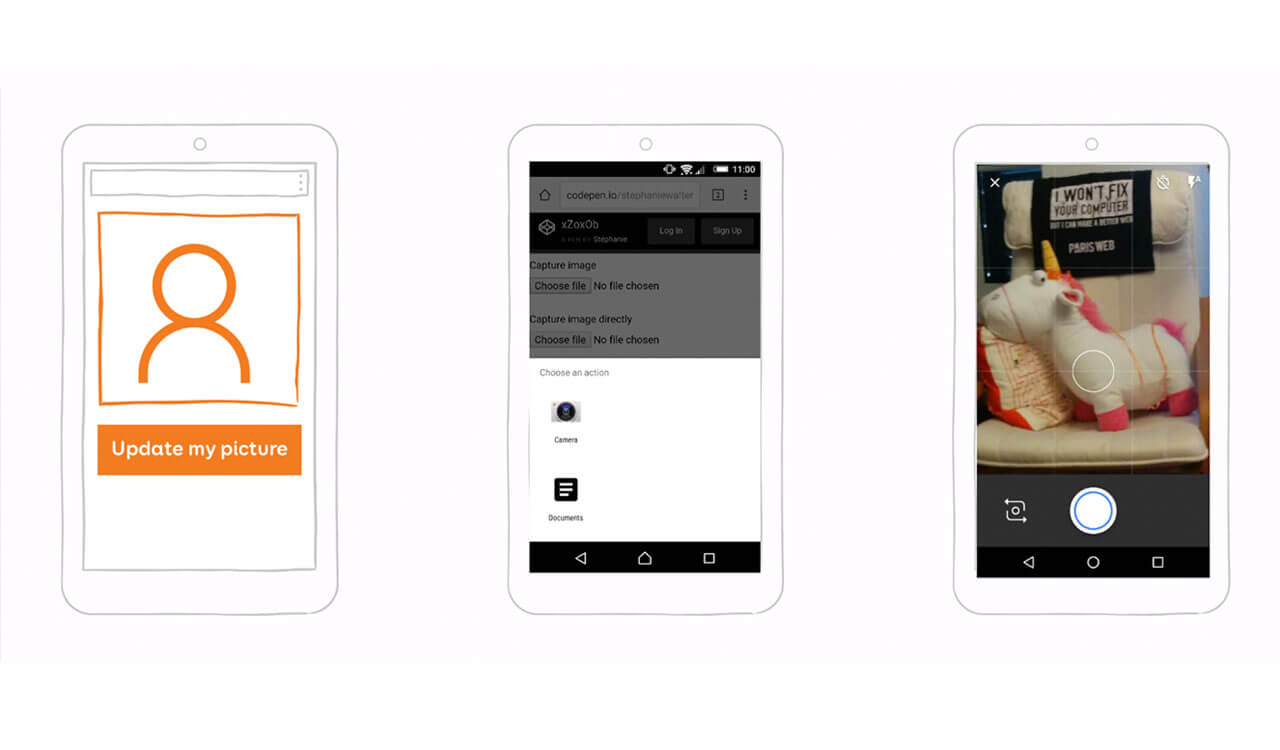 Si vous souhaitez éviter la boîte de dialogue et ouvrir directement l’appareil de photo il suffit d’ajouter l’attribut capture comme ceci :