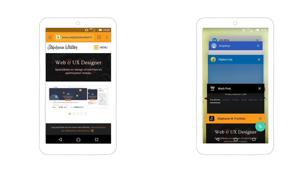 Les utilisatrices verront cette couleur dans la barre d’URL sur Android mais également sur le haut du site si celui-ci est lancé en “browser mode”. Elle est également utilisée pour la barre du haut de l’écran de lancement comme expliqué déjà plus haut et en mode tiroir d’applications quand vous en avez plusieurs d’ouvertes.