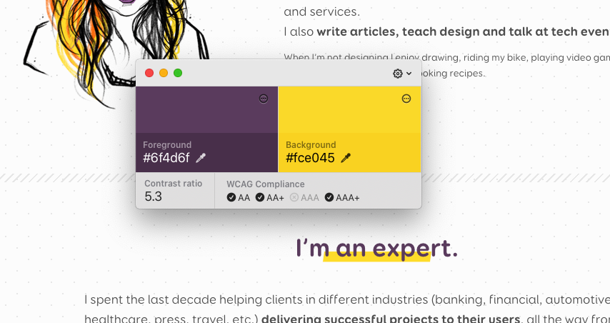 Pika is a cool open source color picker for mac that also lets you compare colors to quickly confirm WCAG compliance. It has different color spaces, keyboard shortcuts and more. I love it. Created by Charlie Gleason (@superhighfives)