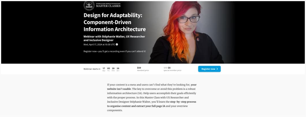 I’m happy to announce I will be running my Design for Adaptability: Component-Driven Information Architecture Masterclass, on Wed, April 17, 2024 at 16:00 UTC with Interaction Design Foundation. We’ll be talking about information architecture, and how to build re-usable components out of a content model. This should help you save precious time, before jumping into any design tool.
