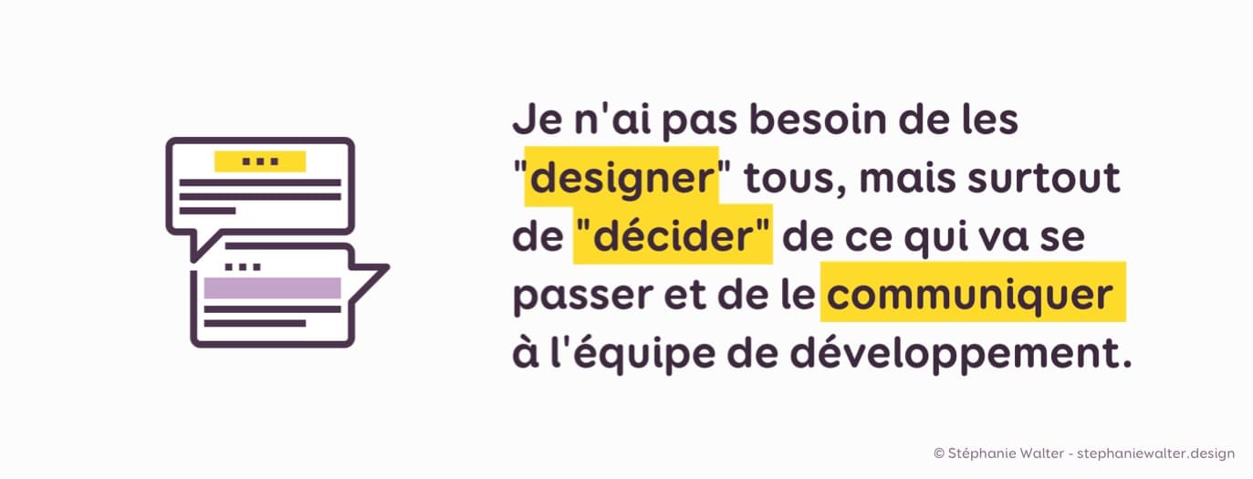 Finalement, ce qui est à retenir : Je n’ai pas besoin de les « designer » tous, mais surtout de « décider » de ce qui va se passer et de le communiquer à l’équipe de développement.